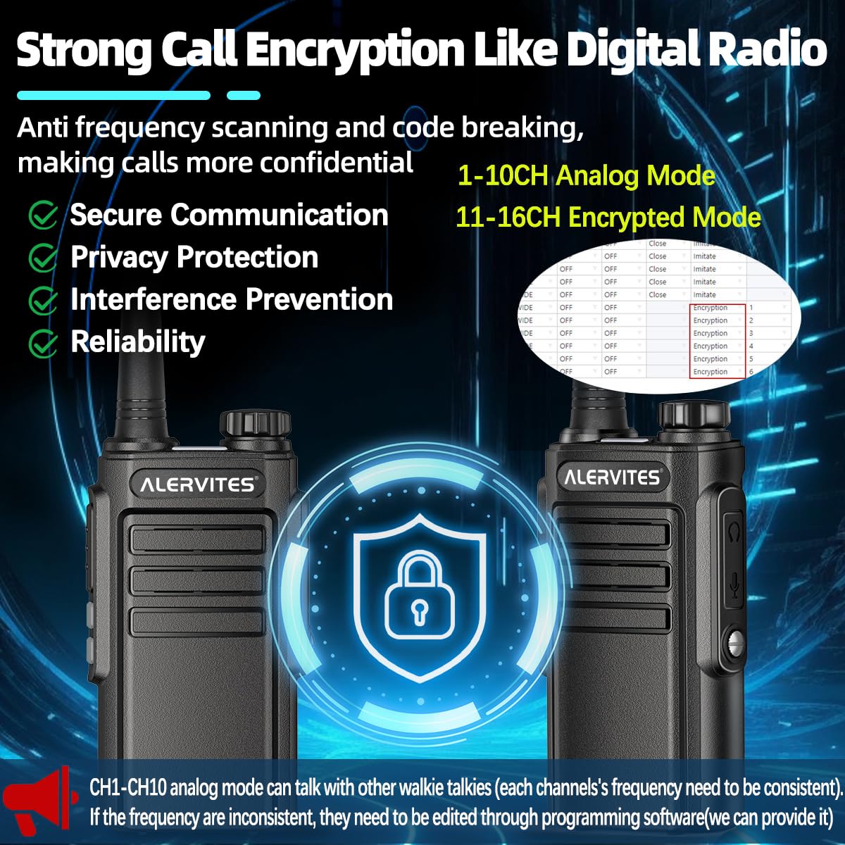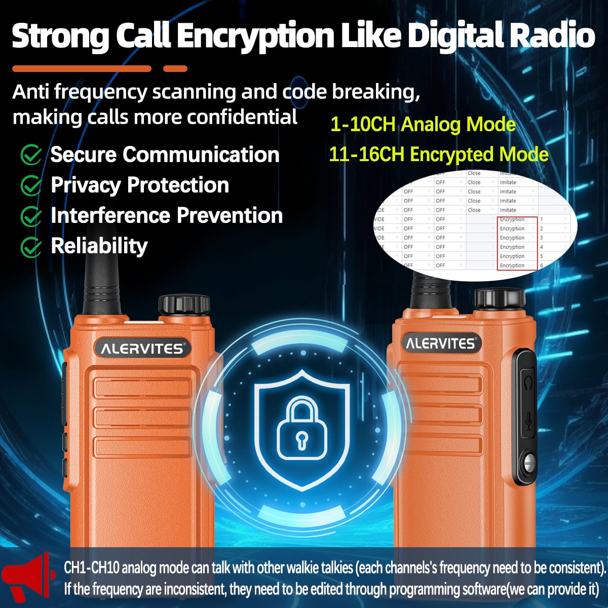 - Encryption Call:Up to 30 channel operation includes analog(CH1-CH10) and encrypted(CH11-CH16)modes. In encrypted mode, no one else can scan and decrypt your frequencies,making calls more confidential,note:In encrypted mode,it can’t communicate with other radios and can only work with the same walkie talkie. If you do not need more advanced encryption, you can change them all to analog walkie talkies through programming software
